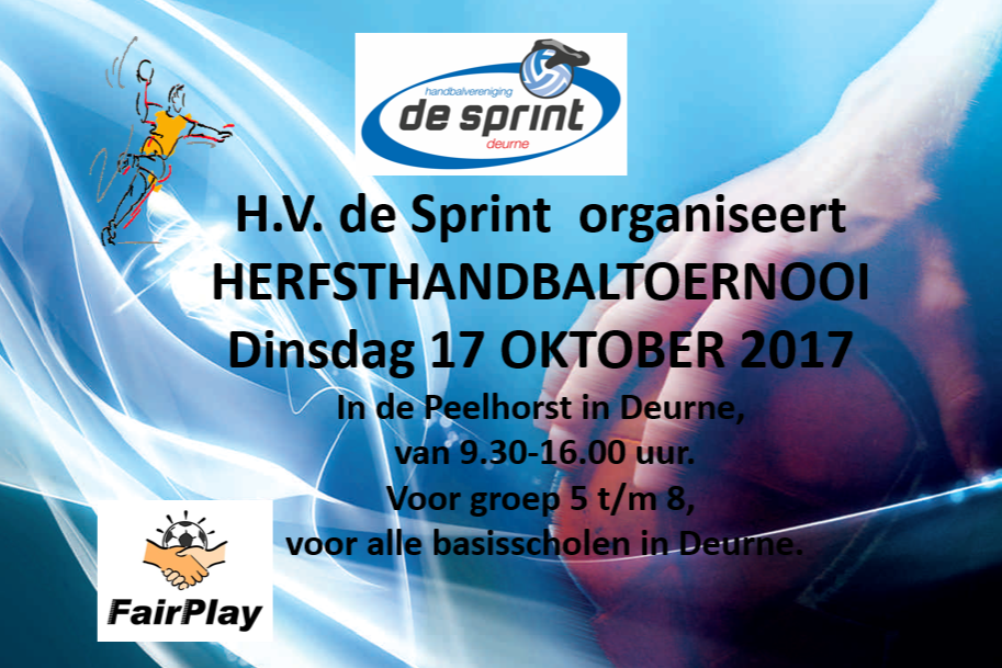 Op dinsdag 17 oktober 2017 wordt er namelijk in sporthal de Peelhorst te Deurne een handbaltoernooi georganiseerd voor de groepen 5 tot en met 8. ’s Morgens (van 9.30-12.30uur) staat het toernooi in het teken van de groepen 5 en 6 en ’s middags (van 13.00-16.00 uur) de groepen 7 en 8. Het gehele toernooi wordt begeleid door de oudste jeugdleden en jeugdtrainers van HV de Sprint.
